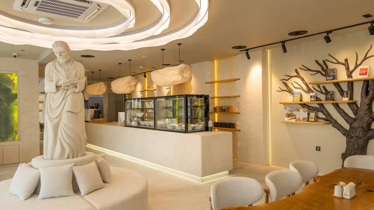 Every detail at Balance is intentional — from the hand-sculpted stone tables to the organic ceiling forms that echo nature.